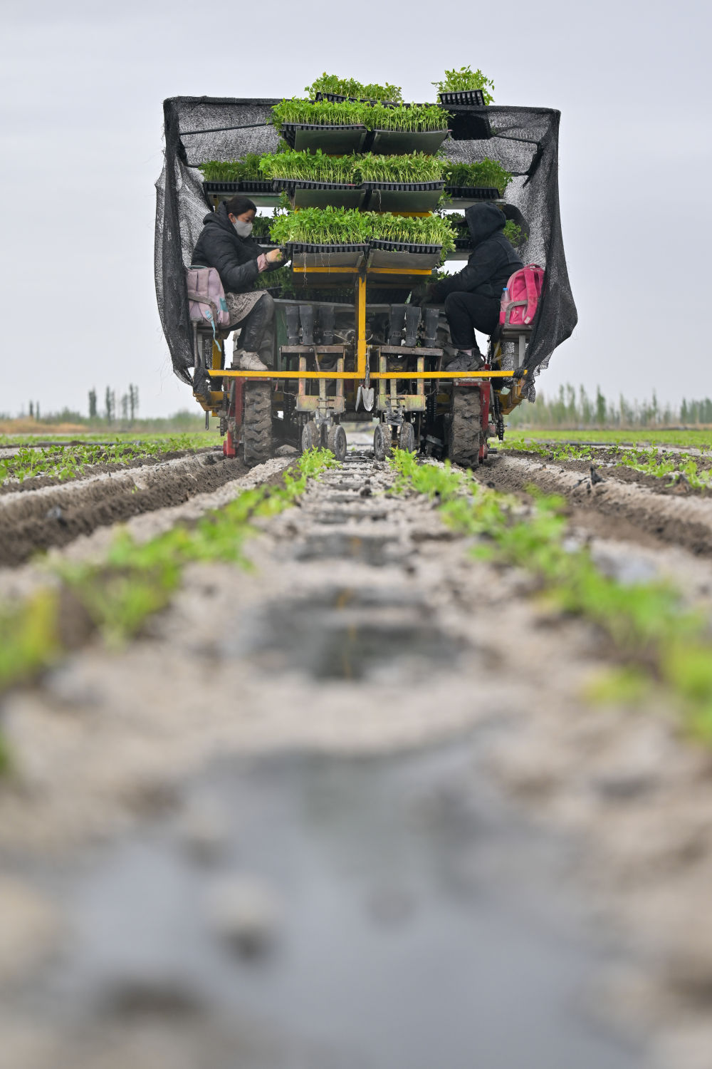 4月26日,正在新疆焉耆回族自治县四十里城子镇,农户正在从动移栽机上投放番茄苗。记者丁磊 摄!