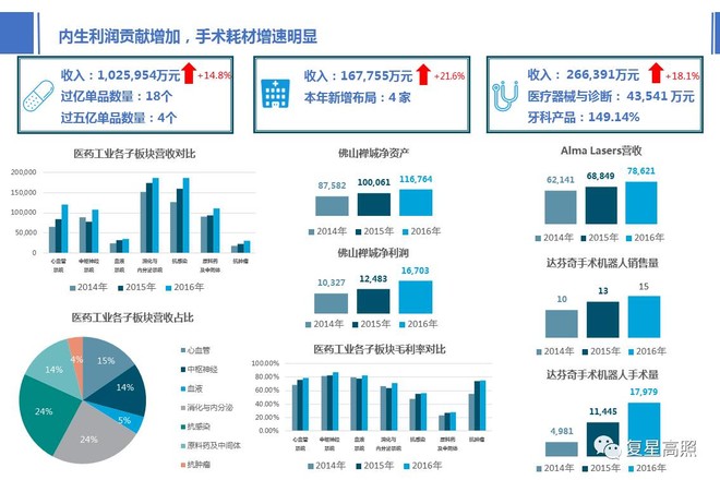 1、医药工业发卖收入初次跨越100亿(见图8),同比添加14。8%,过亿单品数量18个,过五亿单品数量4个。过亿单品比客岁少一个,该当为出售制药,过亿品种摩罗丹削减所致。从各子板块营收来看,各板块均相较2015年有所添加,此中添加最多的是心血管系统和中枢神经系统。而内排泄和抗传染两个系统仍然为公司工业板块营收占比最多的板块,均跨越24%。之前我忘了是谁写了一个帖子,里面说复星医药工业产物的毛利率不如恒瑞,我感觉他没有楚为什么不如恒瑞。复星医药六大板块中,毛利率最高的是中枢神经系统和血液系统,毛利率均跨越80%,不输恒瑞。消化取内排泄系统、抗肿瘤系统和心血管系统跨越70%,取恒瑞半斤八两。那么问题就出正在其他两个系统,抗传染系统和原料药。抗传染系统毛利率61%,原料药28%,且这两个系统的发卖收入占工业全体收入比别离是24%和14%,极大的影响了医药工业板块的毛利程度。恰是因为产物布局和发卖占比分歧才使得工业板块毛利率看起来差了一些。3、医学诊断取医疗器械板块发卖收入266,391万元,同比添加18。19%,因为公司没有拆解,不得而知诊断板块的具体环境。值得留意的是达芬奇手术机械人发卖量添加两台至15台,而因手术量添加带来的耗材收入大增,全年共进行手术17,979例(本处取公司发布的略有差别)。Alma Lasers的发卖收入同比添加14%,