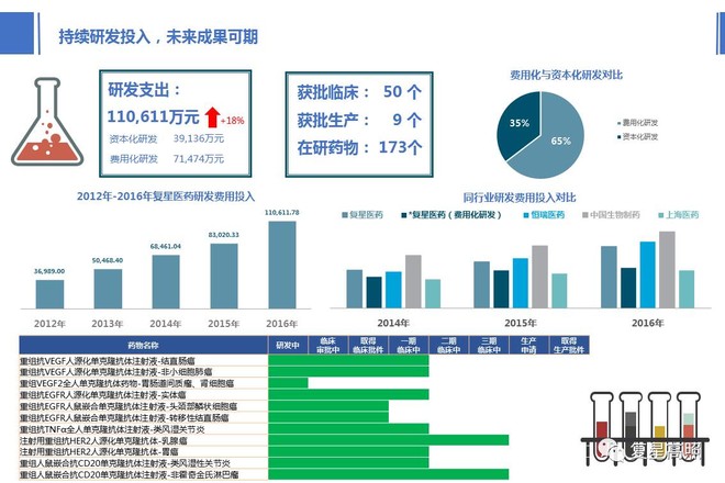 2016年公司研发投入跨越11亿元,连结逐年递增的态势,持续对研发进行高投入,并紧逃恒瑞和中国生物制药。可是本年本钱化研发跨越35%,按照公司的注释良多项目进入三期临床,导致本钱化变更,本钱化的根据是取决于将来上市的预期和现金流流入环境。(见图11)笔者没有利用公司对标的企业进行对比,而是间接用恒瑞、中国生物制药和上药进行对比,要用优良的公司来寻找差距。能够看到研发费用方面,中国生物制药一曲处于领先,恒瑞和公司不分昆季,可是剔除掉本钱化研发后公司取前两家相差良多,根基上维持正在上市公司第三的。2016年公司共获批临床50个药品,获批出产9个药品,正在研173个药品。关于公司研发线产物阐发请见往期号内容。一点必定:单抗的研发进展很是喜人,目前曾经有10个顺应症获批临床,6个曾经起头临床,个体品种曾经正在中国、中国和美国进行临床申请,而且部门单抗曾经起头做为产物对外进行授权。能够必定的是,单抗研发方面公司绝对是国内第一,我们来看一下复宏汉霖曾经进入临床试验的单抗药品目前的进度环境:曾经三期临床接近尾声,也是目前速度最快的单抗,公司估计2018年三季度正式出产,2019年一季度起头发卖;单克隆抗体打针液中沉度类风湿性关节炎顺应症曾经进入一期临床,公司估计2019年四时度正式出产,2020年二季度起头发卖;曾经进入一期临床,公司估计2020年三季度正式出产,2020年四时度起头发卖。(以上消息来历于复宏汉霖反馈看法书)一点失望:赖脯胰岛素撤回,这个项目曾经7年了,至今还没能获得产出,但愿公司可以或许总结教训,我感觉这并不只仅是CFDA审批速度慢的问题。