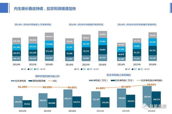 营收、净利润和扣非净利润连结了必然比例的增幅,出格是扣非净利润,跨越了营收和净利润的增幅,延续了2016年半年报以来26%+的趋向。最为担心的资产欠债率本年下降较多,根基处于平安的范畴,后期收购Gland Pharma后可能欠债率会提拔。市场最为关怀的显性业绩表示中,营收、净利润、扣非净利润连结了必然的增幅。笔者不再列举数据,沉点看最为关怀的扣非净利润。扣非净利润反映了公司营业内生增加的趋向,2014年-2016年公司扣非净利润同比增幅别离为29。73%、24。43%和26。36%,连结了平均25%+的程度。图中扣非净利润占净利润比从2014年的63%提拔2016年到74。59%,能否仍按照医药投资型公司进行估值值得列位考虑,出格是正在医药大行业遍及增速放缓的布景下显得愈加凸起和优良。那么有个问题,事实什么缘由让公司连结了很是不变的扣非净利润,这里我们要借用公司年报中的表述内容【既得益于对存量资产和营业的办理和运营能力的不竭提拔,也得益于环绕从业持续不竭的通过投资和并购扩大停业规模】,笔者认为也得益于主要联营企业国药控股对于公司净利润的贡献。国药的收益事实算非经损益仍是算经常性损益这个问题不正在本文会商,仁者见仁智者见智。但能够通过图中的数据看出,国药控股贡献占公司扣非净利润比逐年下降,从2014年的64。24%下降到2016年61。58%。跟着国药2020年运营打算的出台,若是公司仍然想维持国药利润占比下降的趋向,营业内生增加就要进一步加强。