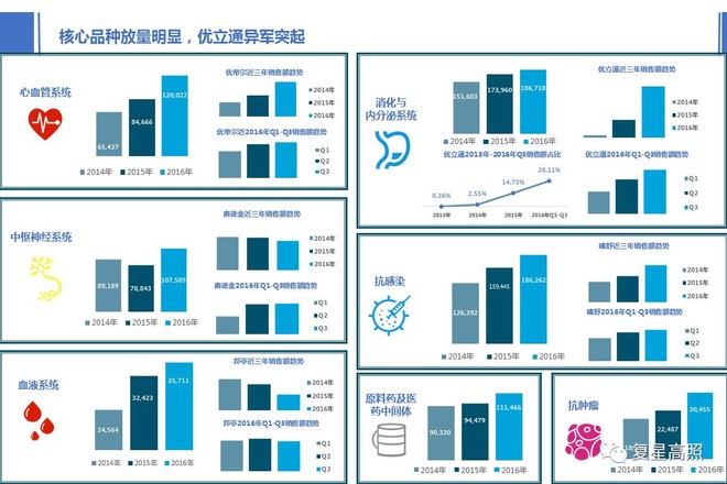 1、心血管系统:发卖收入同比添加41。76%,焦点品种优帝尔近三年增加敏捷,2016年Q1到Q3呈逐步增加的态势;2、中枢神经系统:发卖收入同比添加36。46%,提到中枢神经系统就不得不让人想到奥德金,正在履历了2016年停产的风浪后,奥德金复产后库存量暴增,近三年发卖收入略有下降,但对比Q1-Q3的样本病院发卖趋向来看正在逐步恢复;3、血液系统:发卖收入同比添加10。14%,是增加速度起码的板块。焦点品种邦亭正在近三年的发卖收入趋向下降较着;4、消化取内排泄系统:发卖收入同比添加13。87%。焦点品种优立通本年增加很是敏捷,近三年的发卖额几乎是每年以100%以上的速度增加,同时优立通正在系统中发卖占比,也从0。36%添加到28%。万邦的优立通取恒瑞的瑞扬均正在2013年上市,相差不到一个月,目前从样本病院数据库来看,优立通占比62%,瑞扬只要30%,产质量量、营销能力高下立判。产物不但能研发出来,还要会卖;5、抗传染系统:发卖收入同比添加16。82%。笔者实正在没有想到合信的头孢美唑钠可以或许卖过5亿,这个是大大的不测,近三年是以3亿、4亿、5亿的速度增加。但愿将来能把搏拿也做成过亿品种;企业姑苏二叶是2014岁尾收购而来,极大的丰硕了公司正在β-内酰胺酶剂+抗生素组合的产物线、抗肿瘤系统:发卖收入同比添加35%;7、原料药:发卖收入同比添加17。98%,次要因为沉庆凯林因国内合作敌手遭到FDA惩罚销量大增所致。