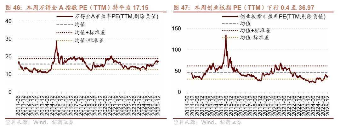 本周全体A股估值程度取上周根基持平。截至12月19日收盘,万得全A指数PE(TTM)为17。15,处于汗青估值程度(10年以来)的66。1%分位数。创业板指PE(TTM)下行0。4至36。97,处于汗青估值程度的28。7%分位数。代表大盘股的沪深300指数PE(TTM)上行0。1至13。29,处于74。3%分位数。代表中小盘股的中证500指数PE(TTM)下行0。1至25。74,处于汗青估值程度的47。7%分位数。