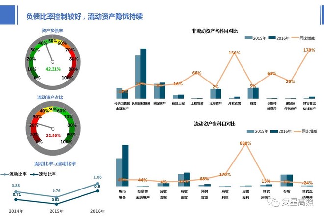 复星医药2016年资产欠债率下降到42。31%(见图5),次要因为年内增发A股,了有息欠债。流动资产占比虽有所提拔,但仍然偏低,没有获得无效改善。流动比率和速动比率相较2015年获得很大改善,平均债权成本3。4%,境外债权成本3。93%。资产端,非流动资产3,300,348万元,同比添加 10。47%,分科目看次要因为持久股权投资和固定资产添加所致。图中开辟收入同比156%添加次要【因为本年加大研发投入所致】,其他非流动性资产同比170%添加,次要【因为预付让渡款及地盘出让款添加所致】。流动资产中,货泉资金大幅添加49%至196,739万元,应收股利大幅添加次要【因为参股企业尚未领取股利所致】。