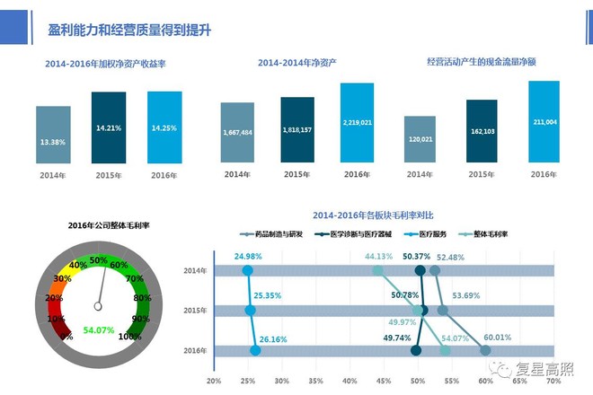 除经常性收益外,2016年运营勾当现金流量也连结很是良性的增加趋向(见图,增幅均高于发卖收入增幅,达到211,004万元,同比添加30。17%。营运周期85。9天,同比加快10。1天,应收账款周转缩短3天。净资产提拔22。05%至2,219,021万元,每股净资产9。19元,加权净资产收益率提高0。04个百分点至14。25%。2016年公司全体毛利率54。07%,比2015年提拔4。1%,次要缘由为发卖布局获得改善,因为集中采购和原料供应链优化以及降本增效等办法获得提拔。分板块毛利率:1、医药工业毛利率60。01%,较2015年提高6。32%,次要因为高毛利率产物发卖量添加,出格是优立通和优帝尔两个品种发卖添加所致。2、医学诊断取医疗器械毛利率49。74%,同比下降1。04个百分点,公司没有申明缘由,笔者妄测可能是因为达芬奇手术机械人耗材发卖添加,这块毛利率较低从而降低了本板块毛利率所致,这点还需要公司申明缘由;3、医疗办事毛利率26。16%,同比添加0。81个百分点。本年公司进行医疗办事集中采购,降本增效所致。