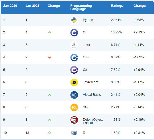 TIOBE 2026 年 01 月份的编程言语排行榜曾经发布,C# 再次被评为 2025 年度编程言语,这是三年内第二次获此称号,年度编程言语的评选根据是过去一年中排名提拔幅度最大。